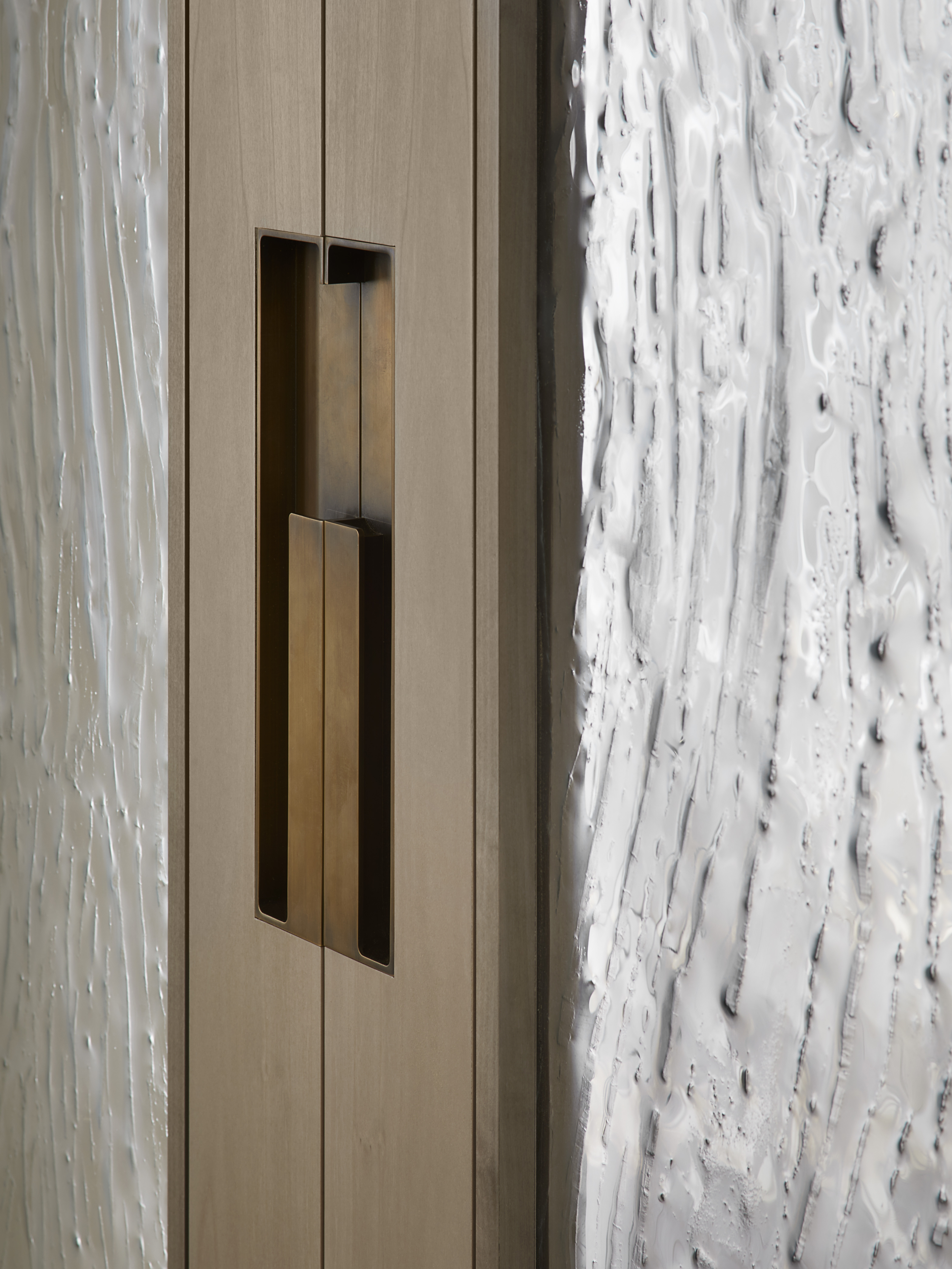 Using juxtaposed textures, these bespoke entrance pull handles are defined by intricate detailing that references the curves of the Mediterranean waves coupled with the hand hammered three dimensional face replicating rippled sand. It was then finished in polished chrome to shimmer like the glaring August Greek sun!
