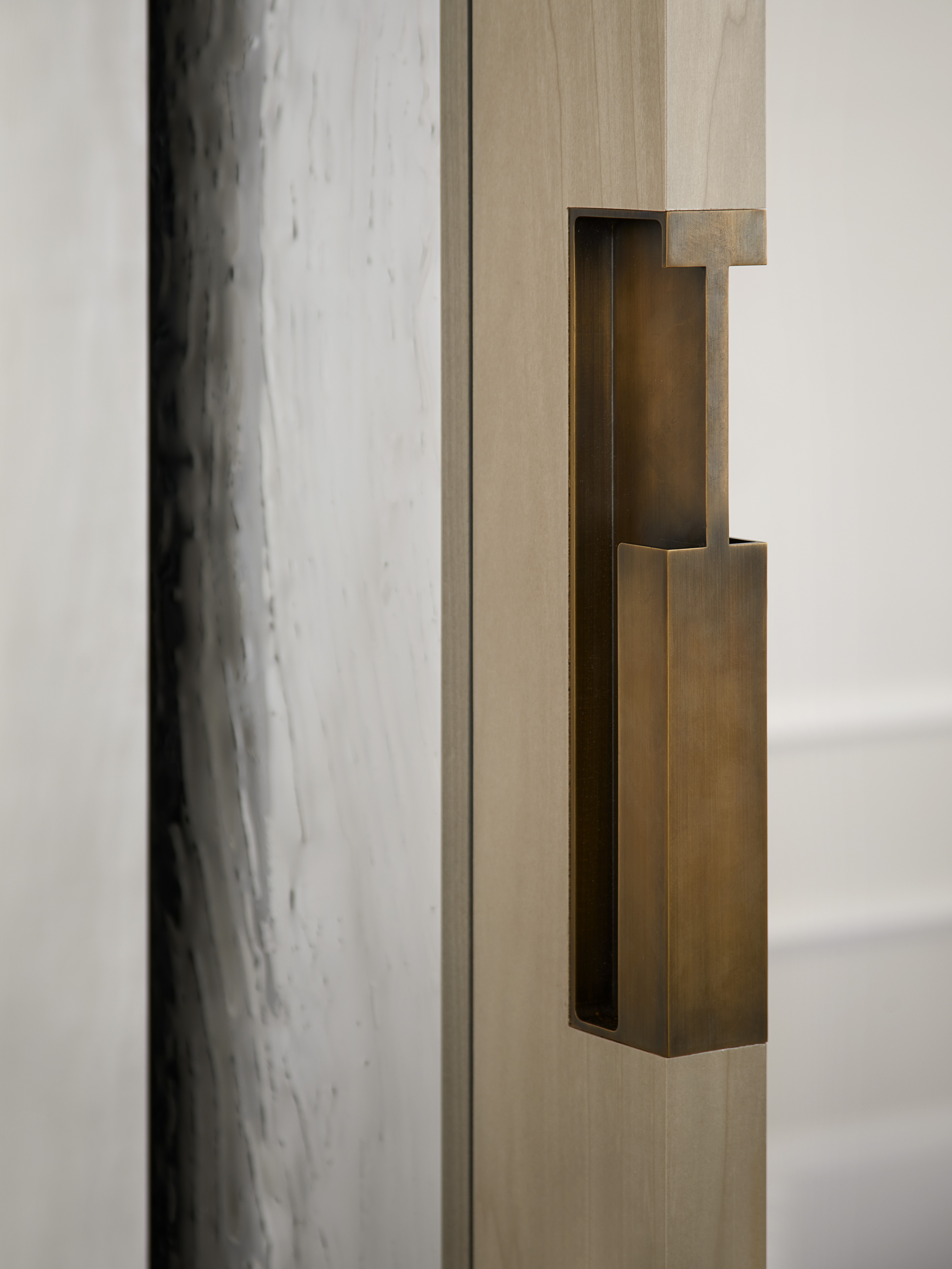 Opulent, dramatic, and decadent are the style cues that echo around the residence, and these clean, streamlined pulls add a sense of minimalist individuality.